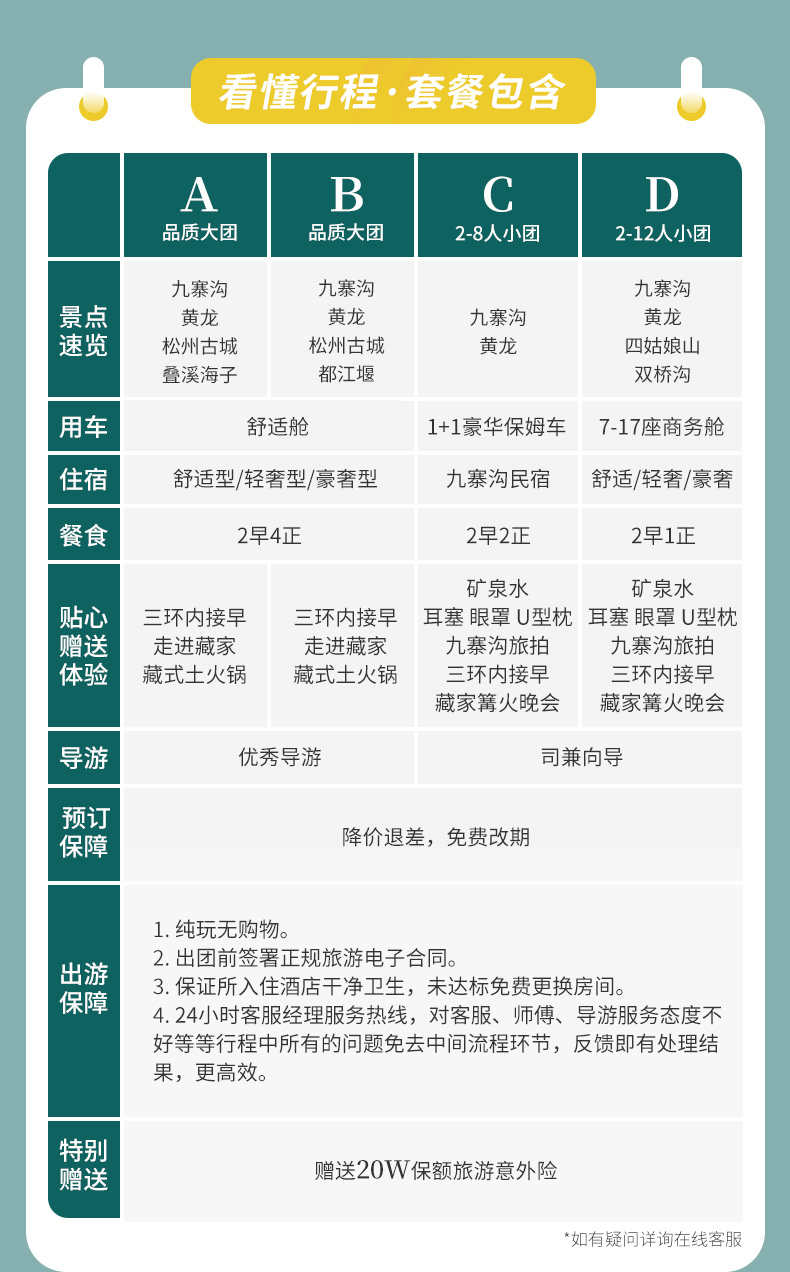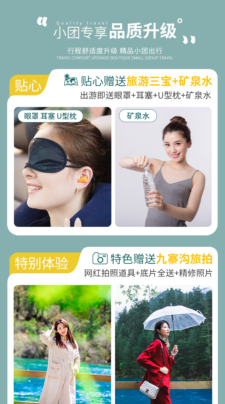 所有套餐仅酒店和在酒店用的早晚餐不同,景点路线一样,所以不同套餐(酒店)会安排在同一个车上。九寨沟/黄龙属于高原山区,气候和当地条件不比城市,请勿携带1周岁及以下的婴幼儿参团,也不适宜年满70周岁的老年人,如有婴儿和老年人,请告知客服!