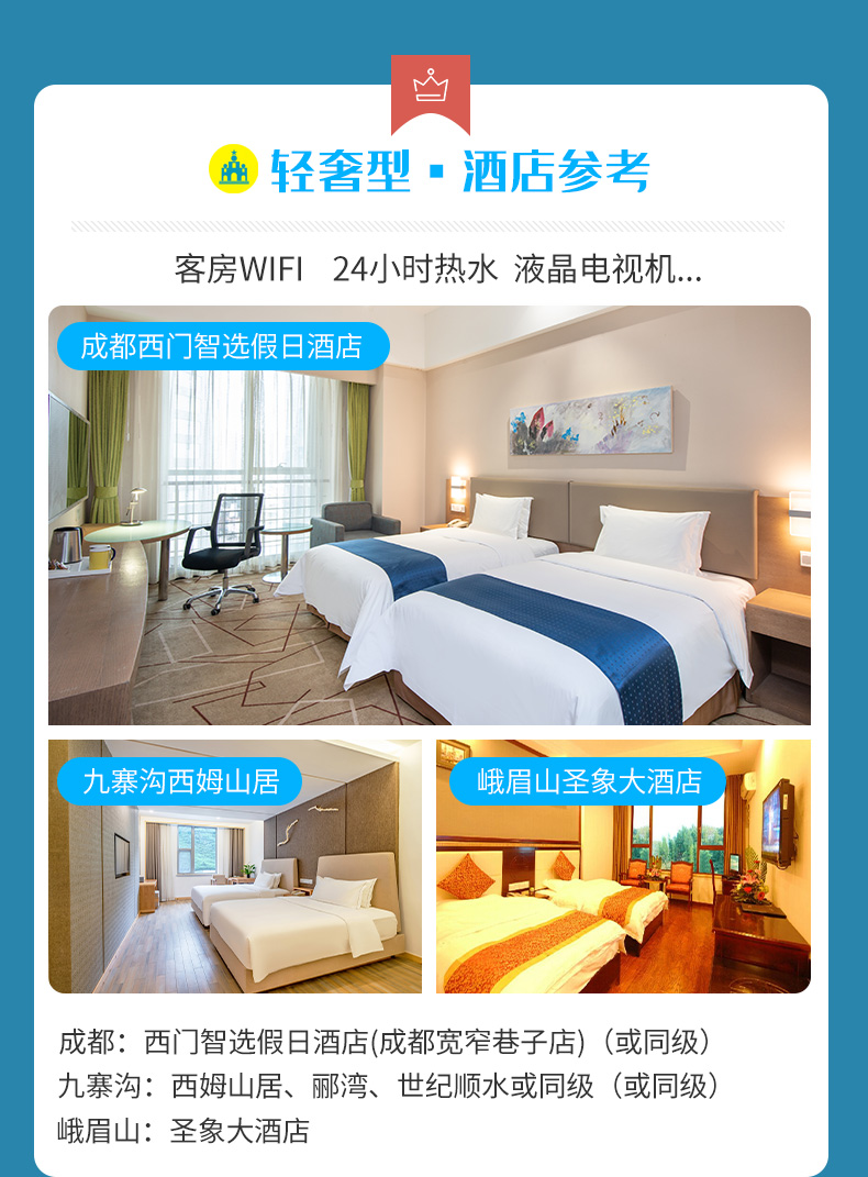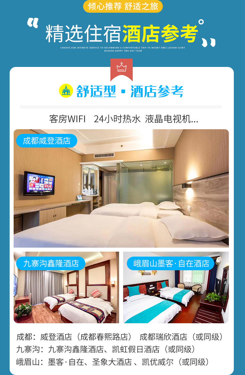 【景点门票】:都江堰熊猫乐园、九寨沟风景区、黄龙风景名胜区、峨眉山、乐山大佛
